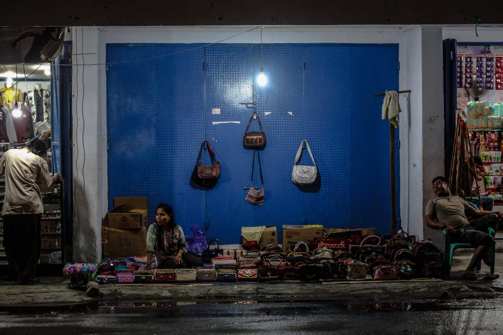 Pedagang tas tangan membuka lapak di depan sebuah toko kelontong dalam kompleks pertokoan Poso yang tutup diwaktu malam. Pedagang semacam ini banyak ditemui diseantero kota dan mereka memanfaatkan berbagai macam ruang untuk menjajakan dagangannya. Selain teras toko seperti ini, adapula yang berjualan diatas mobil bak terbuka. Kompleks pertokoan Poso sendiri masih menjadi titik penting aktifitas perdagangan di kota ini. Dan sudah seperti itu sejak lama. Namun peta ini kemungkinan akan berubah. Dipindahkannya pasar rakyat yang semula berada tepat di depan kompleks pertokoan ini ke wilayah selatan, kemudian kehadiran Mall Poso City di wilayah barat kemungkinan besar akan merangsang kehadiran pusat-pusat pedagangan baru di wilayah tersebut.