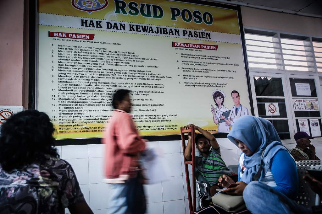 Para pasien di RSUD Poso tengah menantikan namanya dipanggil untuk mendapatkan layanan kesehatan yang mereka butuhkan. Jumlah penduduk yang semakin membengkak di wilayah ini ikut berkontribusi pada meningkatnya jumlah orang-orang yang membutuhkan layanan dasar, termasuk kesehatan. Tiap hari kerja, ruang tunggu terus disesaki oleh para pasien. Di rumah sakit ini ada sekitar 170 tempat tidur bagi mereka yang mesti menjalani rawat inap. Formasi dokter spesialis lumayan lengkap. Fasilitas stroke center juga tersedia dan menjadi layanan andalan di RUSD ini.